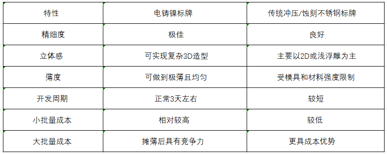 電鑄可以生產(chǎn)出壁厚均勻且極?。?.04mm起) 的標(biāo)牌,既節(jié)省材料、減輕重量,又因?yàn)殒嚤旧淼母邚?qiáng)度而保持足夠的結(jié)構(gòu)剛性。