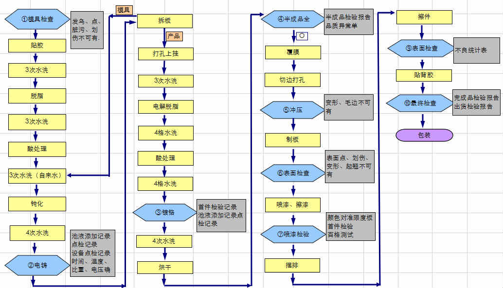 電鑄厚標(biāo)工藝流程為:模具檢查→電鑄→鍍鉻→覆膜→沖壓→表面檢查→噴漆檢驗(yàn)→背膠→檢查→包裝出貨